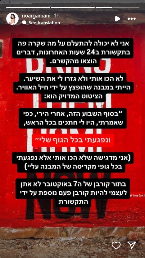 نفت المحتجزة الإسرائيلية السابقة لدى حركة حماس "نوعا أرغماني" ما نقله الإعلام الإسرائيلي بأنها تعرضت للضرب من قبل عناصر كتائب القسام.