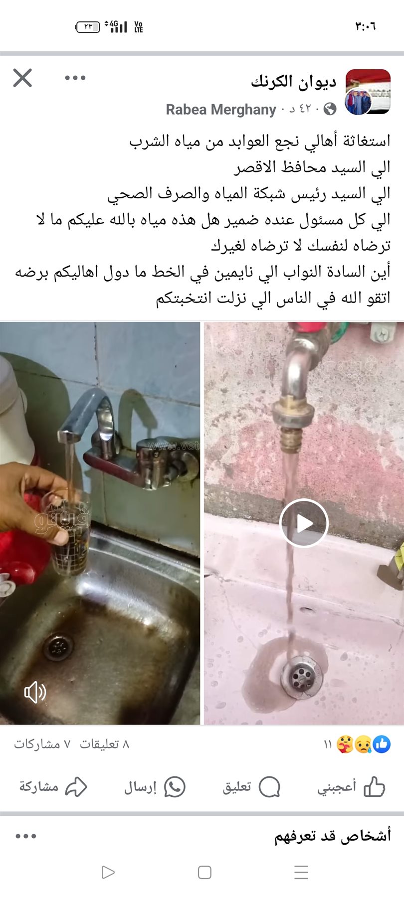 ضجت صفحات التواصل الاجتماعي فيسبوك بمحافظة الأقصر بمنشورات استغاثة حول تغير لون مياه الشرب داخل منزل مواطن مقيم بناحية نجع العوابد بمنطقة منشأة العماري.