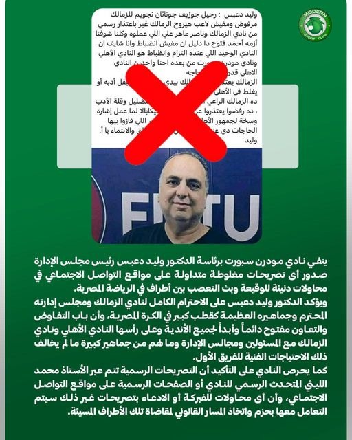 نفى نادي مودرن سبورت برئاسة الدكتور وليد دعبس رئيس مجلس الإدارة صدور أى تصريحات مغلوطة متداولة على مواقع التواصل الاجتماعي في محاولات دنيئة للوقيعة وبث التعصب بين أطراف في الرياضة المصرية.