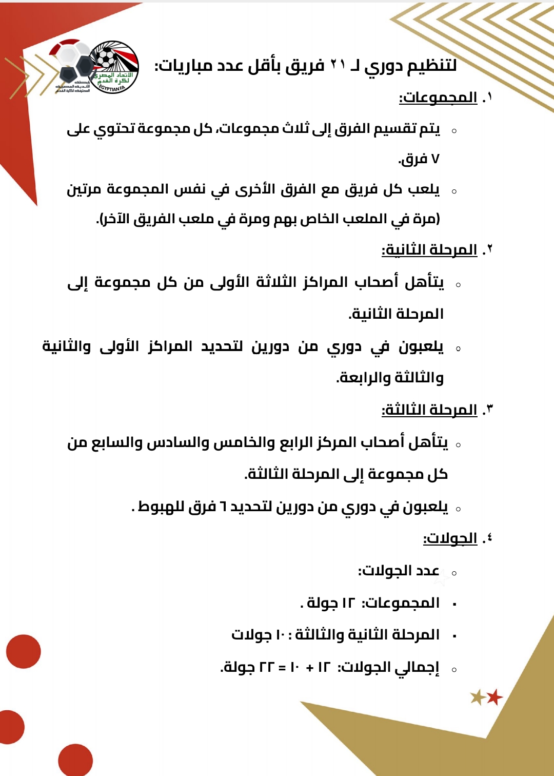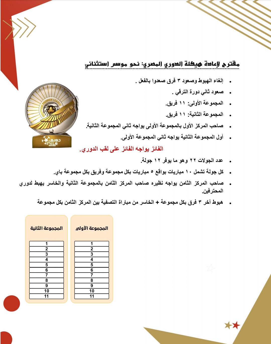 وواصل البيان:"الاقتراح الذي قدمه المقاولون منذ فترة وقبل انتهاء الموسم بفترة يتلخص في إقامة مسابقة الدوري من مجموعتين وهو ما طرحه الكثيرين وتبناه عدد كبير، وتم طرح عمل المجموعتين من 11 فريقا لكل مجموعة وهو ما يختصر المدى الزمني للموسم تمهيدا للعودة إلى الشكل الطبيعي الموسم الذي يليه".