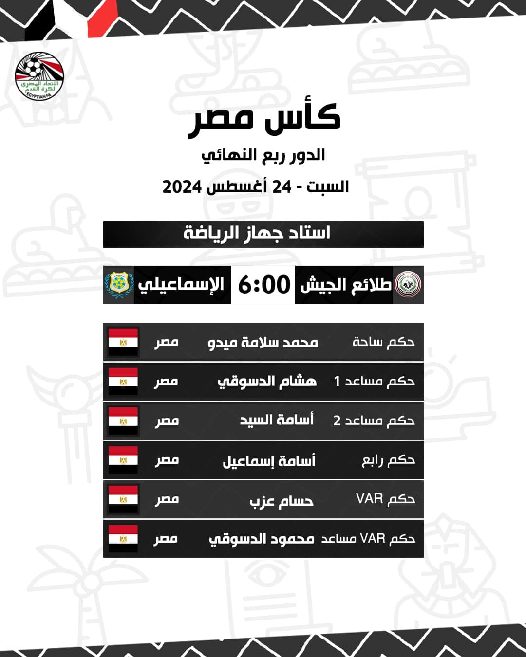 كأس مصر، أعلنت لجنة الحكام باتحاد الكرة المصري، أسماء حكام مباراتي اليوم السبت، ضمن مواجهات دور الثمانية ببطولة كأس مصر لموسم 2023 - 2024، وجاءت على النحو التالي: