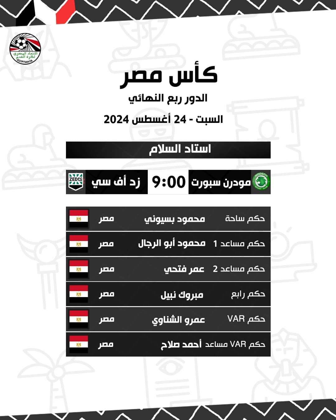 ويلتقي فريق مودرن سبورت وزد إف سي السبت القادم بربع نهائى كأس مصر.