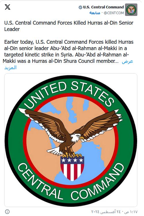 وقالت "سينتكوم" في بيان لها، يوم الجمعة، عن مقتل أبو عبد الرحمن المكي، العضو في مجلس الشورى لجماعة "حراس الدين"، مشيرة إلى أنه "مسؤول عن الإشراف على عمليات إرهابية انطلاقًا من سوريا".