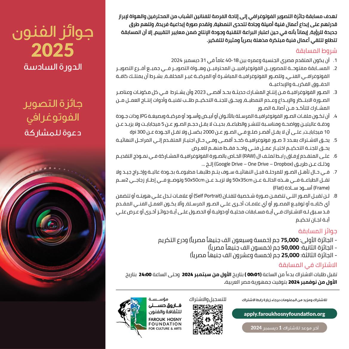 أعلنت مؤسسة فاروق حسنى للثقافة والفنون عن شروط الاشتراك في جوائز الفنون للدورة السادسة لعام 2025 في أفرع “التصوير – العمارة – النحت – النقد الفني التشكيلي – التصوير الفوتوغرافي”.