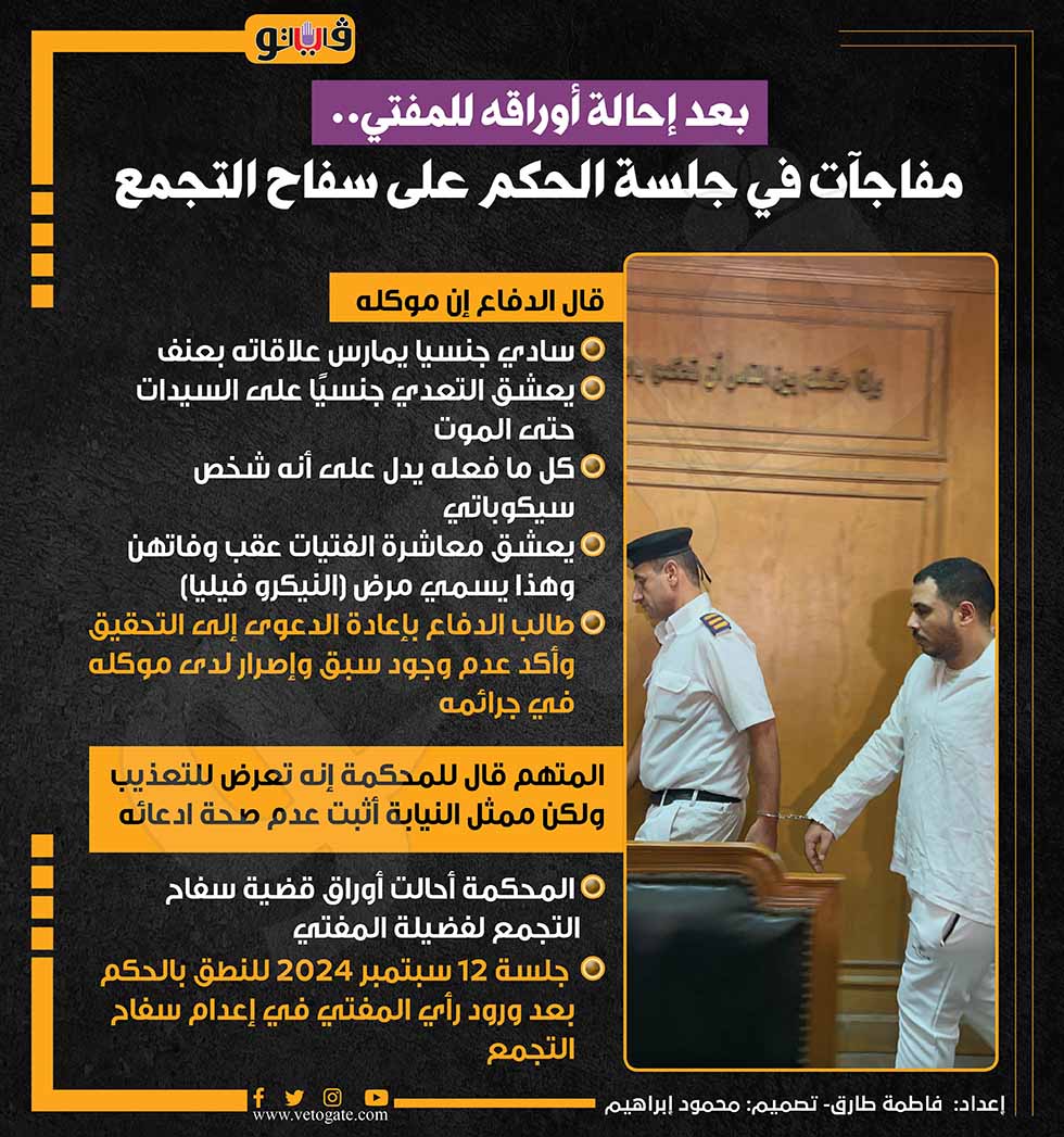 بعد إحالة أوراقه للمفتي.. مفاجآت في جلسة الحكم على سفاح التجمع (إنفوجراف) السبت 24/أغسطس/2024 - 03:11 م 8/24/2024 3:11:14 PM سفاح التجمع من جلسة اليوم فاطمة طارق شارك طباعة 18 حجم الخط شارك طباعة سفاح التجمع قضية سفاح التجمع فضيلة المفتي المحكمة اعدام سفاح