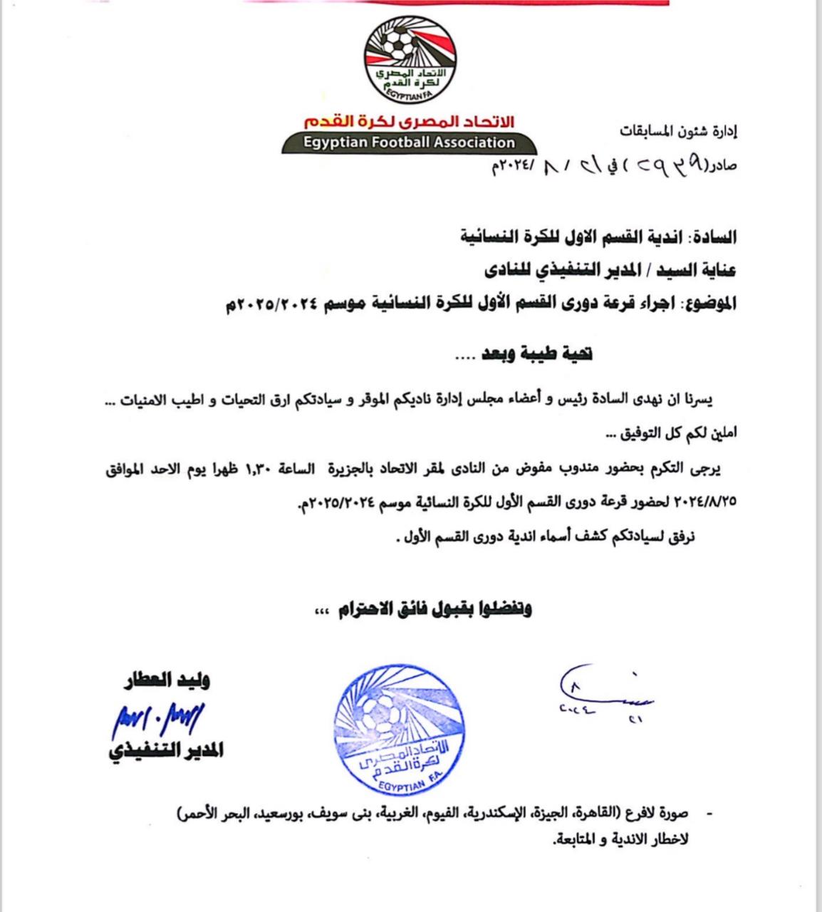 قررت إدارة المسابقات باتحاد الكرة تحت إشراف عامر حسين عضو المجلس، إقامة قرعة دوري الكرة النسائية للموسم ٢٠٢٤ - ٢٠٢٥ في الواحدة والنصف ظهر اليوم الأحد بمقر اتحاد الكرة.