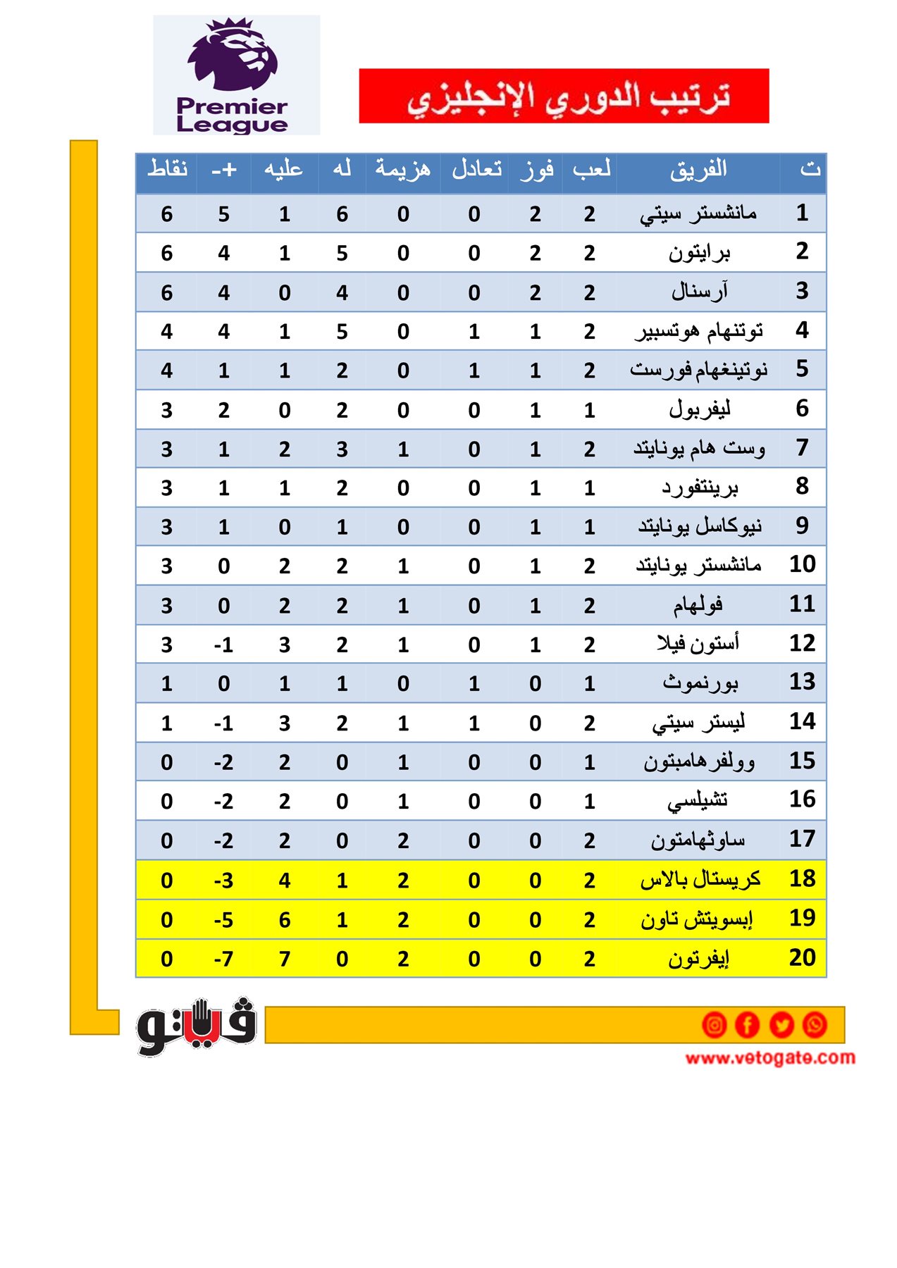 ترتيب الدوري الإنجليزي، يتصدر مانشستر سيتي بالتساوي مع برايتون وأرسنال جدول ترتيب الدوري الانجليزي الممتاز قبل مباريات ختام الجولة الثانية اليوم الأحد.
