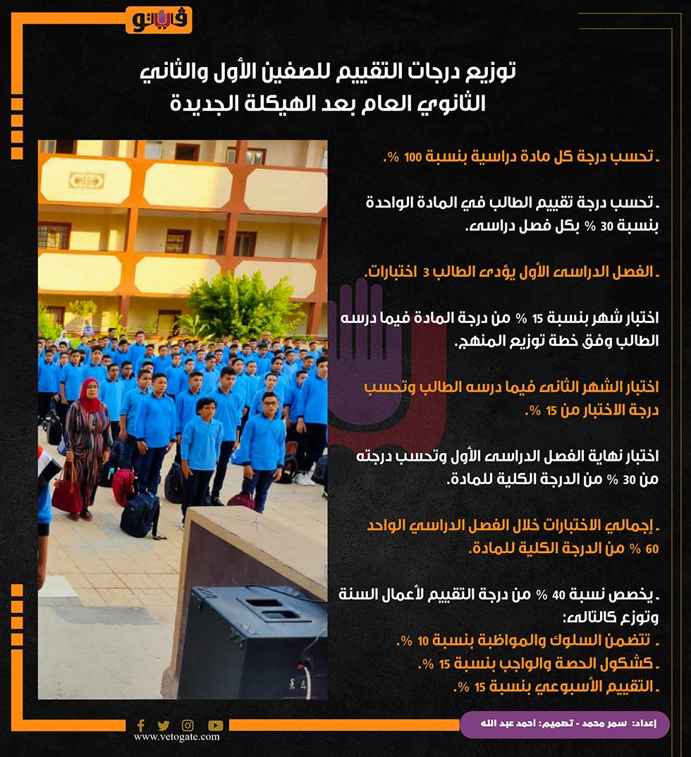 توزيع درجات التقييم للصفين الأول والثاني الثانوي العام بعد الهيكلة الجديدة (إنفوجراف) الأحد 25/أغسطس/2024 - 01:08 م 8/25/2024 1:08:57 PM وزارة التربية والتعليم سمر محمد شارك طباعة 18 حجم الخط شارك طباعة للصفين الأول والثاني الثانوي الثانوي العام توزيع درجات التقييم للصفين الأول والثاني الثانوي