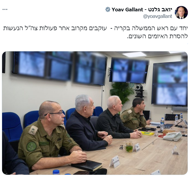 فور توجيه حزب الله الضربة على الاحتلال الإسرائيلي، بدا على وزير حرب الاحتلال الإسرائيلي يوآف جالانت القلق، وكتب تغريدة على منصة "أكس"، تويتر سابقًا، قال فيها "نحن نراقب عن كثب، بالتعاون مع رئيس الوزراء في كاريا، الإجراءات التي يتخذها جيش الدفاع الإسرائيلي لإزالة التهديدات المختلفة."