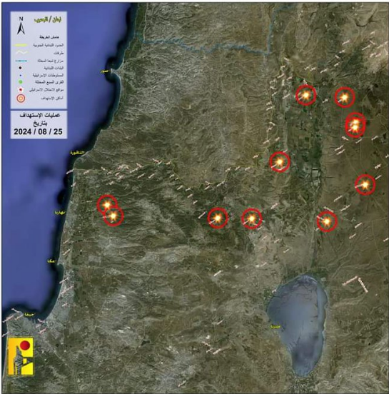 وتابع الحزب بيانه، الذي جاء فيه "ثانيًا، عدد صواريخ الكاتيوشا التي أطلقت حتى الان تجاوزت 320 صاروخا بإتجاه مواقع العدو.. ثالثًا، المواقع التي تم استهدافها وإصابتها بعون الله تعالى: (1- قاعدة ميرون. 2- مربض نافي زيف. 3- قاعدة زعتون. 4- مرابض الزاعورة. 5- قاعدة السهل. 6- ثكنة كيلع في الجولان السوري المحتل. 7- ثكنة يو أف في الجولان السوري المحتل. 8- قاعدة نفح في الجولان السوري المحتل. 9- قاعدة يردن في الجولان السوري المحتل. 10 - قاعدة عين زي تيم. 11- ثكنة راموت نفتالي)