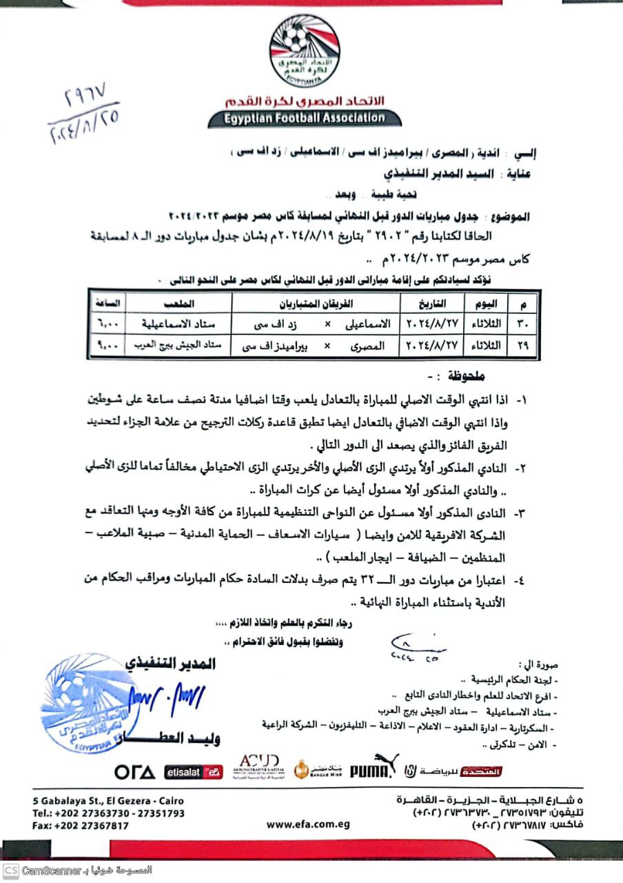 كأس مصر، أعلنت إدارة المسابقات باتحاد الكرة تحت إشراف عامر حسين عضو اتحاد الكرة مواعيد مباريات الدور قبل النهائي لكأس مصر والتي تضم المصري وبيراميدز والإسماعيلي وزد.