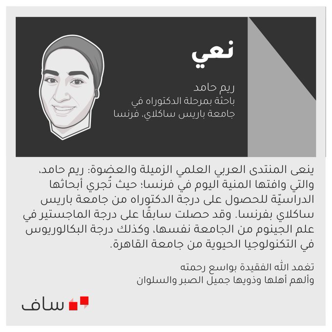 من جهته، نعى "المنتدى العربي العلمي" عضوته ريم حامد: "والتي وافتها المنية في فرنسا (السبت) تغمد الله الفقيدة بواسع رحمته وألهم أهلها وذويها جميل الصبر والسلوان".