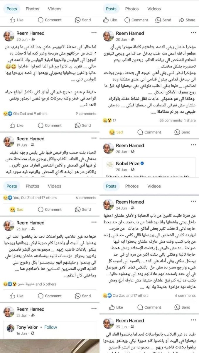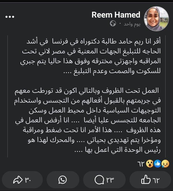 وقالت ريم قبل اختفائها: "أقر انا ريم حامد طالبة دكتوراه في فرنسا في أشد الحاجة للتبليغ الجهات المعنية في مصر لأني تحت المراقبة وأجهزتي مخترقة، وفوق هذا حاليا يتم جبري للسكوت والصمت وعدم التبليغ.. العمل تحت الظروف، وبالتالي أكون قد تورطت معهم في جريمتهم بالقبول أفعالهم من التجسس واستخدام التوجيهات السياسية داخل محيط العمل وسكن الجامعة للتجسس عليا أيضا.. أنا أرفض العمل في هذه الظروف.. هذا الأمر، أنا تحت ضغط ومراقبة ومؤخرا يتم تهديدي بحياتي.. والمحرك لهذا هو رئيس الوحدة التي أعمل بها".