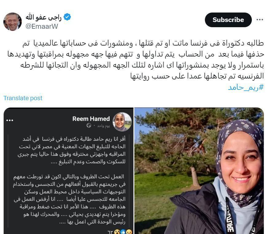 وفاة أم اغتيال ريم حامد في باريس؟.. الباحثة المصرية أبلغت السلطات أنه يتم مراقبتها واختراق أجهزتها.. نشطاء يؤكدون اغتيالها.. وشقيقها: مفيش حاجة مؤكدة.. والخارجية تتابع مع السلطات الفرنسية