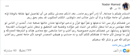 وخلال ساعة كتب منشورا آخر " السلام عليكم يا جماعة.. أنا نادر أخو ريم حامد... بعد اذنكم محدش يتكلم عن أي تفاصيل ليها علاقة بالوفاة لإنه مفيش أي حاجة مؤكدة ولا أي دليل جنائى لحد دلوقتي.. الكلام المكتوب قد يضر بحق ريم.