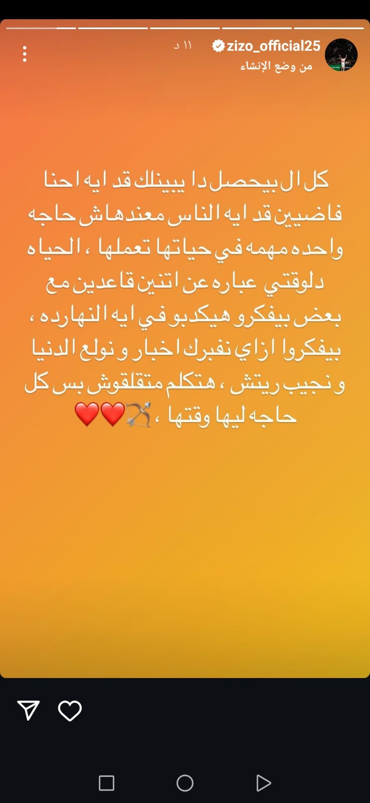 ونشر زيزو عبر حسابه بموقع انستجرام: كل اللي بيحصل دا يبينلك قد ايه إحنا فاضيين قد إيه الناس معندهاش حاجة واحدة مهمة في حياتها تعملها، الحياة دلوقتي عبارة عن اتنين قاعدين مع بعض بيفكروا هيكدبوا في ايه النهاردة، بيفكروا إزاي نفبرك أخبار ونولع الدنيا ونجيب ريتش، هتكلم متقلقوش بس كل حاجة ليها وقتها.