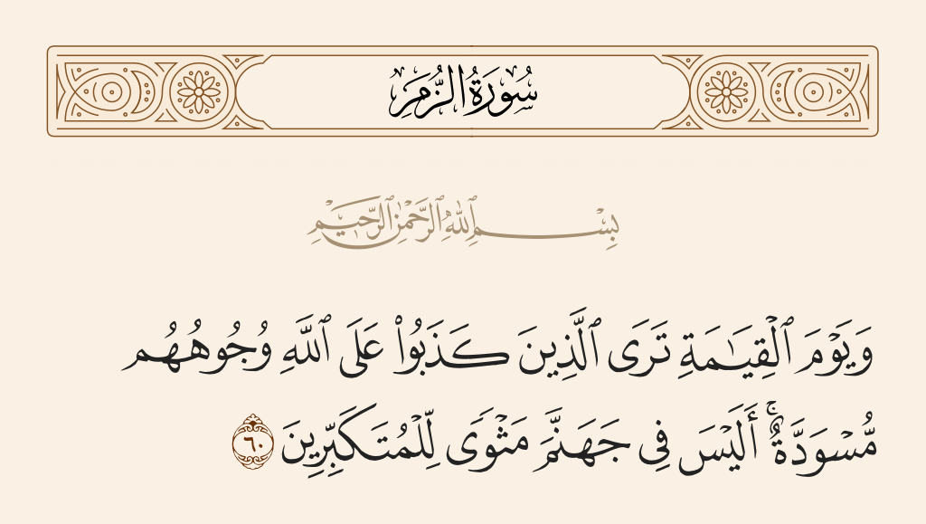 قال تعالى: «وَيَوْمَ الْقِيامَةِ تَرَى الَّذِينَ كَذَبُوا عَلَى اللَّهِ وُجُوهُهُمْ مُسْوَدَّةٌ أَلَيْسَ فِي جَهَنَّمَ مَثْوىً لِلْمُتَكَبِّرِينَ».