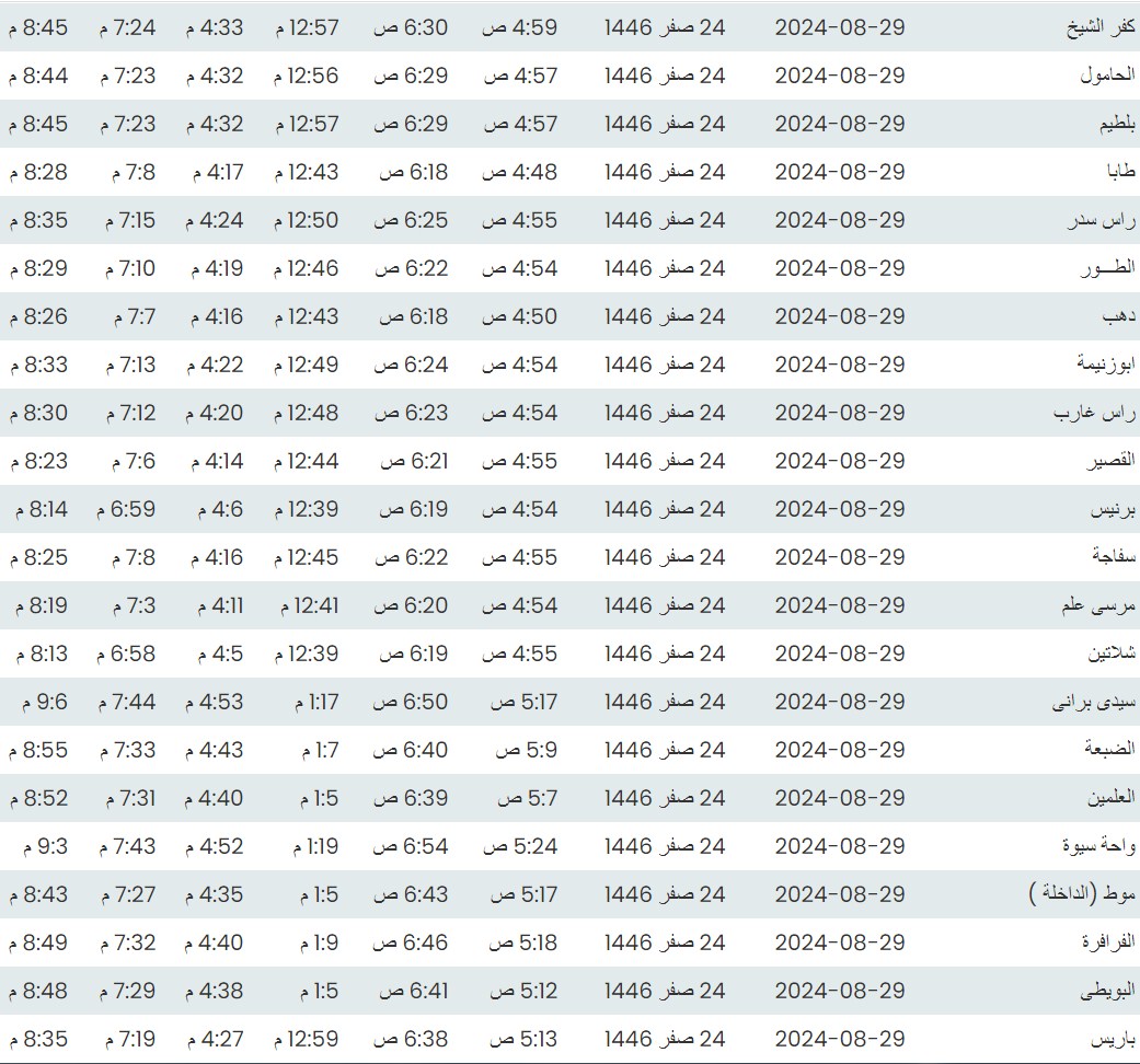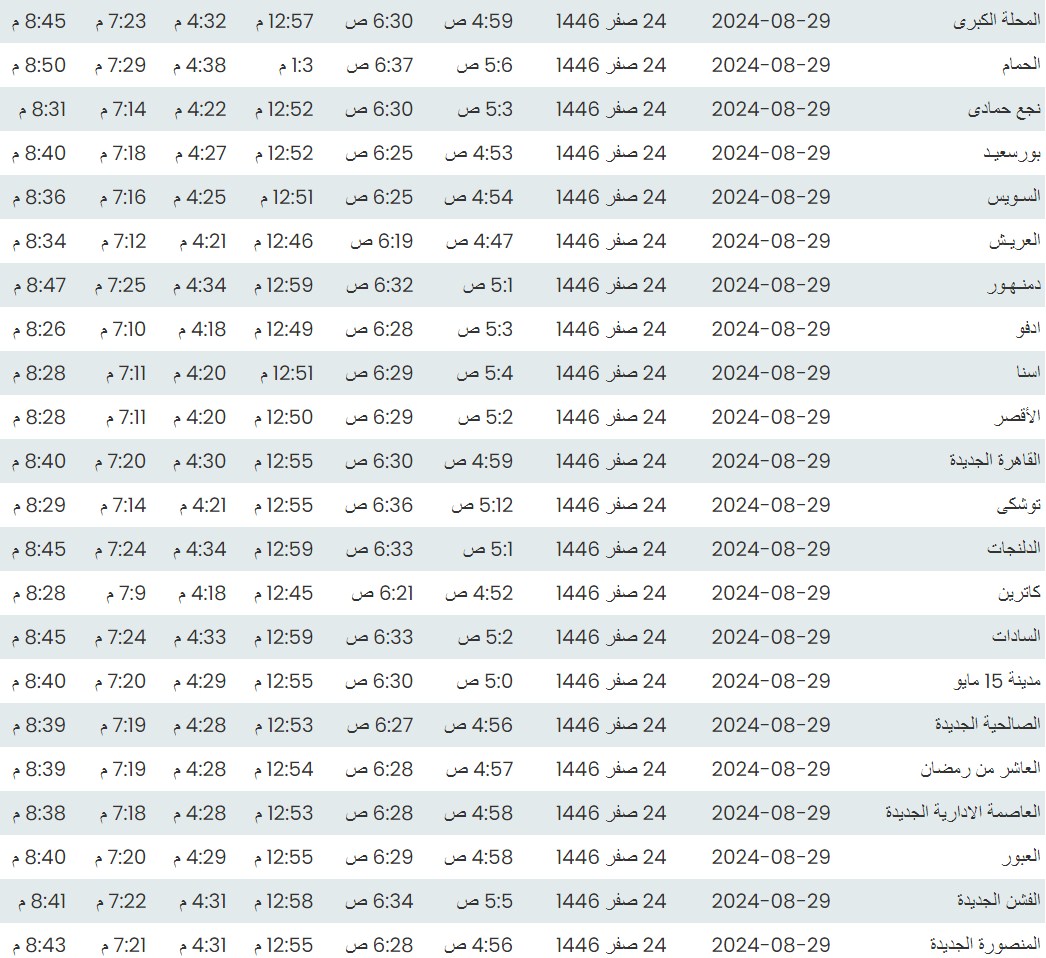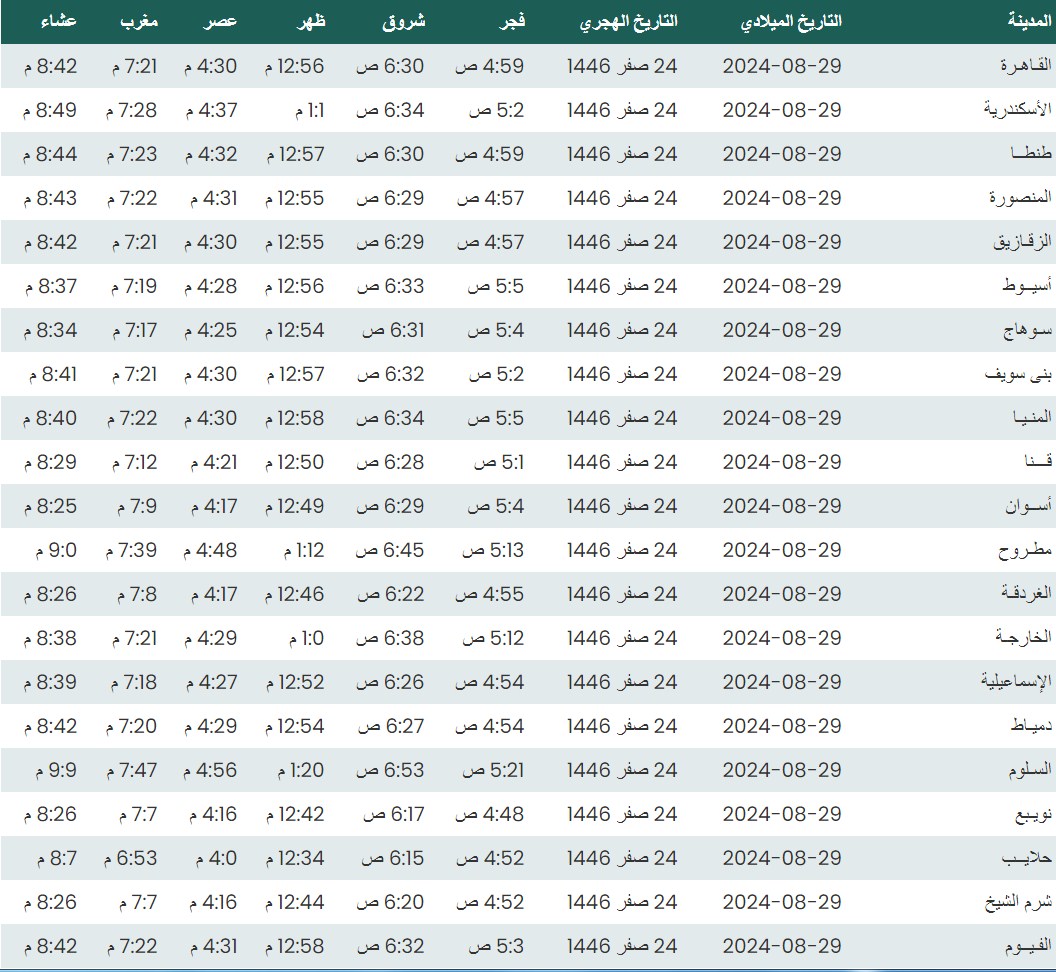 وفيما يلي مواقيت الصلاة، لعدد من مدن ومحافظات الجمهورية من واقع بيانات الهيئة العامة للمساحة