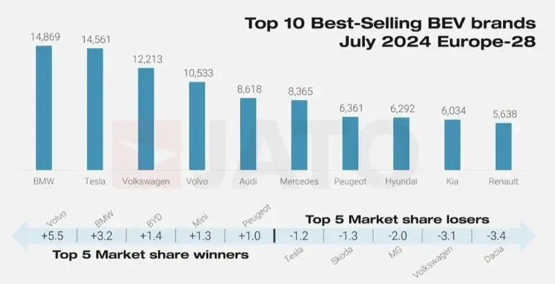كما انخفض العدد الإجمالي لمبيعات السيارات الكهربائية في أوروبا بنسبة 6% على أساس سنوي، وفقا لما أعلنته JATO Dynamics أن هذا الانخفاض بسبب الافتقار إلى الحوافز الحكومية والمخاوف بشأن قيم إعادة البيع، وعلى الرغم من حصول مجموعة بي إم دبليو على المركز الأول، إلا أن السيارة الكهربائية الأكثر مبيعًا في أوروبا الشهر الماضي كانت موديل Y بهامش كبير، حيث بيعت 9.544 سيارة في يوليو، وكانت ثاني أكثر السيارات الكهربائية مبيعًا في أوروبا هي فولفو EX30 بمبيعات 6.573 سيارة، تليها فولكس فاجن ID 4 بمبيعات 5.295 سيارة.
