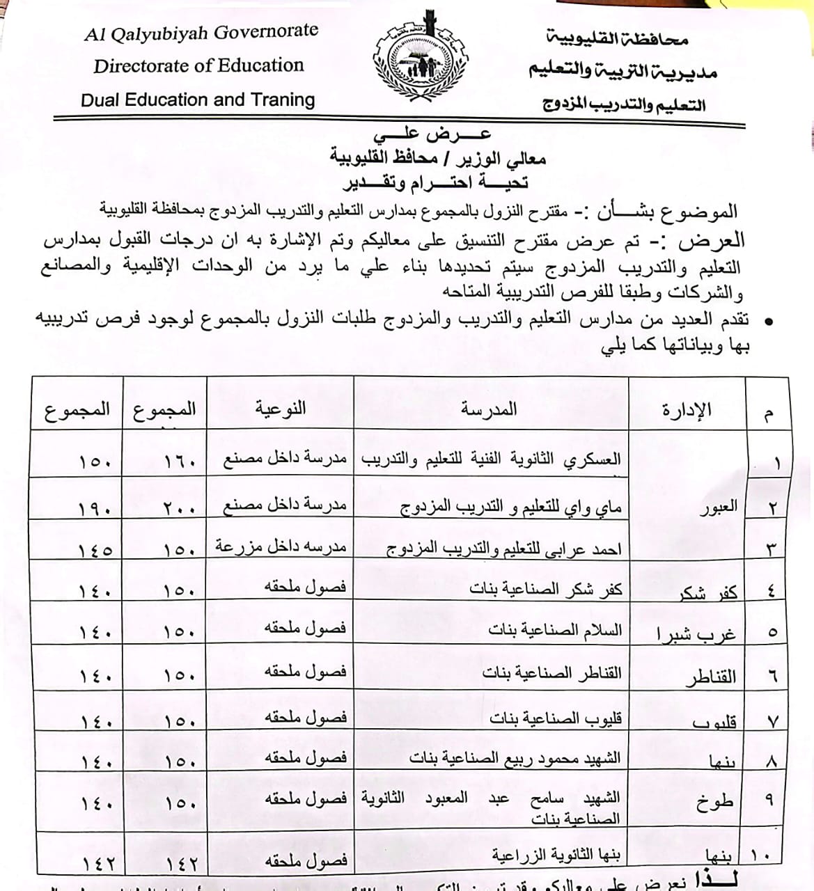 كما وافق المحافظ علي النزول بدرجات القبول بمدارس التعليم والتدريب المزدوج بمحافظة القليوبية وذلك وفقا للبيان الآتي: