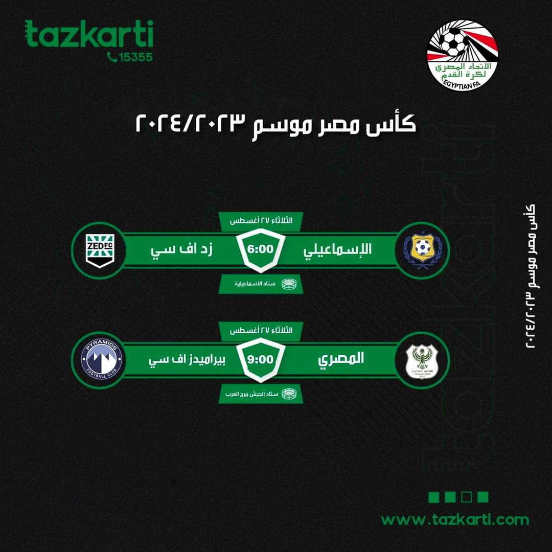 كأس مصر، أعلنت شركة تذكرتي فتح التذاكر لجماهير الكرة المصرية الراغبة في حضور نصف النهائي لكأس مصر والتي تضم المصري وبيراميدز والإسماعيلي وزد.