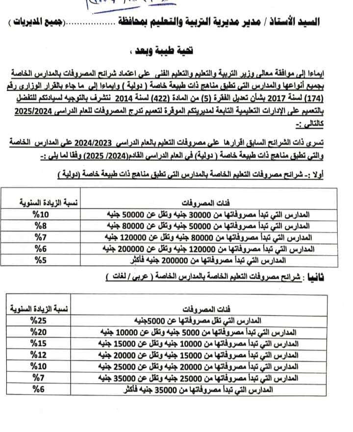 ١٠% للمدارس من ٢٠ الف جنيه الي ٢٥ الف جنيه