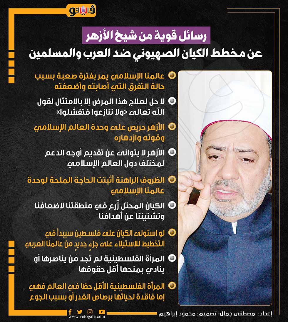 رسائل قوية من شيخ الأزهر عن مخطط الكيان الصهيوني ضد العرب والمسلمين (إنفوجراف) الإثنين 26/أغسطس/2024 - 07:28 م 8/26/2024 7:28:23 PM الدكتور أحمد الطيب شيخ الأزهر الشريف مصطفى جمال شارك طباعة 18 حجم الخط شارك طباعة شيخ الأزهر العالم الإسلامي الكيان الصهيونى المراة الفلسطينية دول العالم الاسلامي
