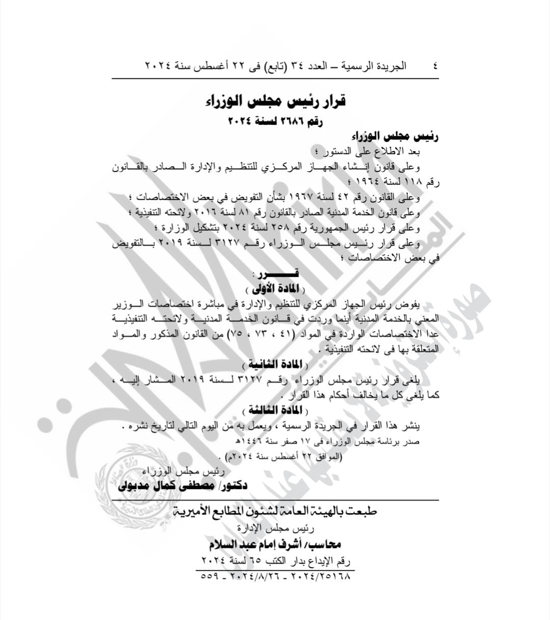 نشرت الجريدة الرسمية في عددها رقم 34 (تابع) الصادر في 22 أغسطس 2024، قرار الدكتور مصطفى مدبولي، رئيس مجلس الوزراء رقم 2686 لسنة 2024م، بتفويض الدكتور صالح الشيخ رئيس الجهاز المركزي للتنظيم والإدارة، في مباشرة اختصاصات الوزير المعنى بالخدمة المدنية أينما وردت في قانون الخدمة المدنية ولائحته التنفيذية، عدا الاختصاصات الواردة في المواد (٤١، ٧٣ ٧٥) من القانون المذكور والمواد المتعلقة بها في لائحته التنفيذية.