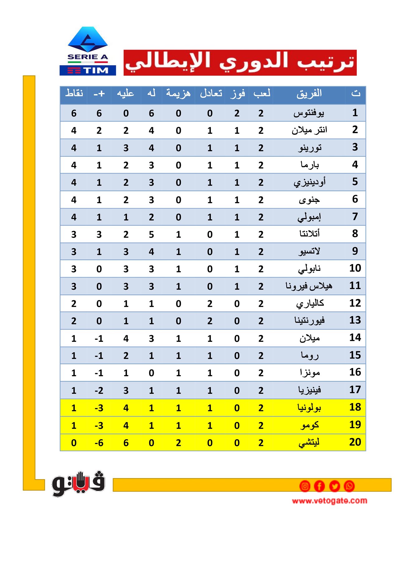 ترتيب الدوري الايطالي بعد الجولة الثانية