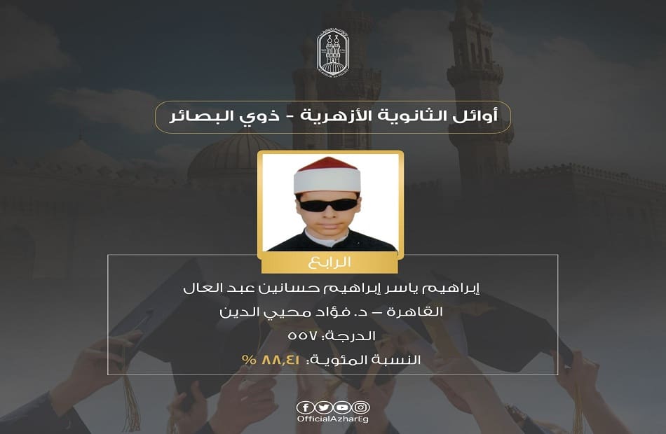 نعى فضيلة الإمام الأكبر أ.د. أحمد الطيب، شيخ الأزهر الشريف، الطالب ياسر إبراهيم، الحاصل على المركز الرابع على مستوى الجمهورية على أصحاب ذوي البصائر في الشهادة الثانوية الأزهرية، والذي وافته المنية اليوم، بعد صراع ومعاناة مع مرض السرطان.