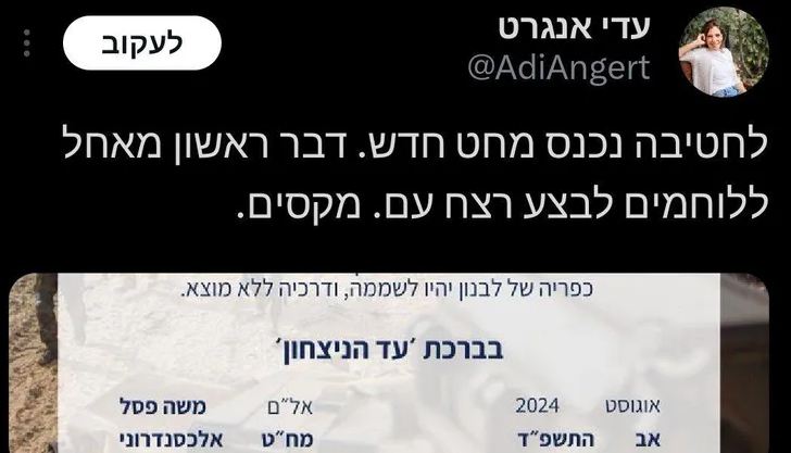 وفي تغريدة أخرى، كتبت عن لالي درعي، والدة الجندي سعدية درعي الذي قتل بالحرب في غزة، أنها “تفتخر بالموت. إنه أمر فظيع، تلك هي الصهيونية الدينية. طائفة من آكلي الموت".