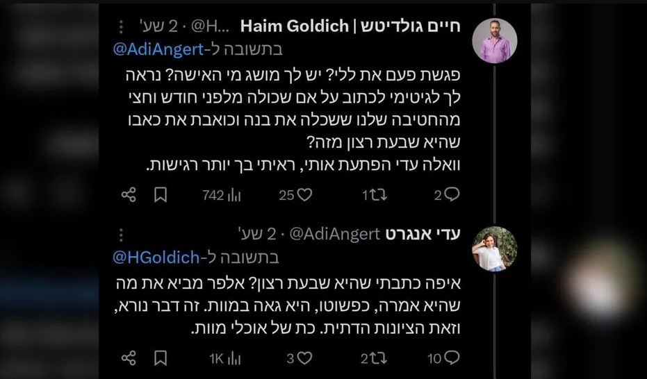 وكتبت عدي إنجيرت، الضابطة المسئولة عن الصحة العقلية في لواء احتياط ألكسندروني (16) الإسرائيلي في ممر نيتسريم ، سلسلة من التغريدات القاسية ضد الجنود المشاركين في العدوان على قطاع غزة والجمهور القومي المتدين، اتهمتهم بالتحريض على الإبادة الجماعية، وصرح متحدث باسم الجيش الإسرائيلي اليوم الثلاثاء أن "الحدث قيد الفحص".