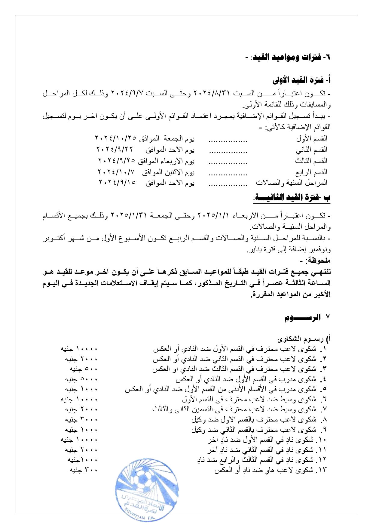 وبحسب منشور اتحاد الكرة تكون فترة القيد الأولي اعتبارًا من السبت 2024/08/31 حتى السبت ۲۰۲٤/٩/٧ وذلك لكل المراحل والمسابقات وذلك للقائمة الأولى.