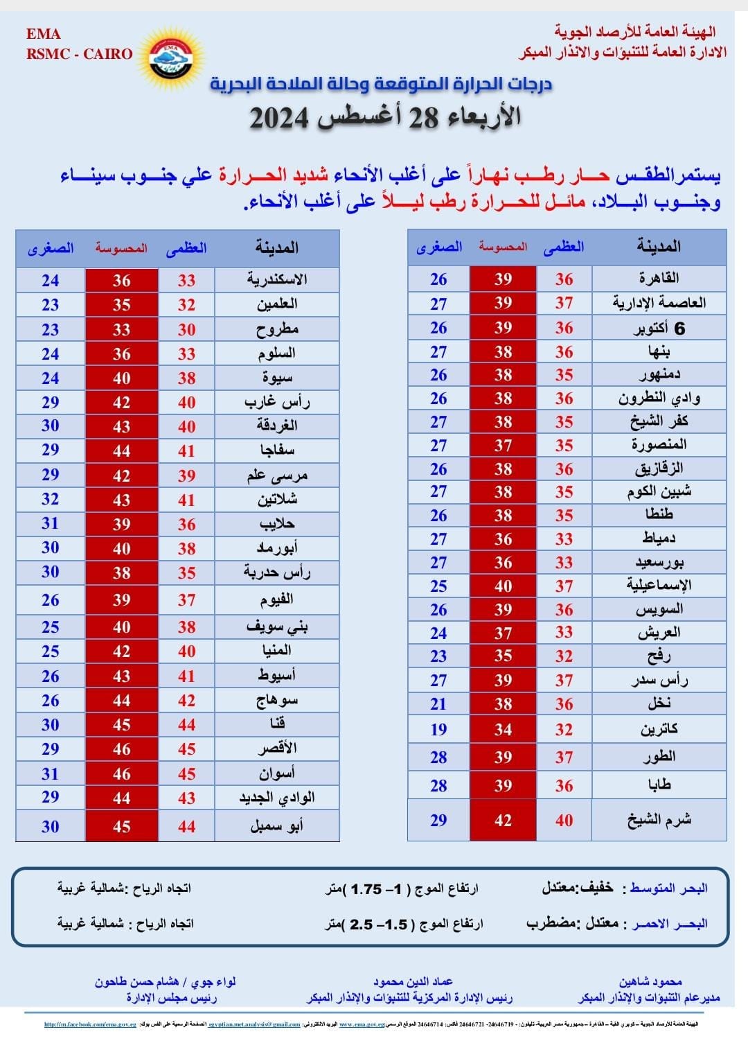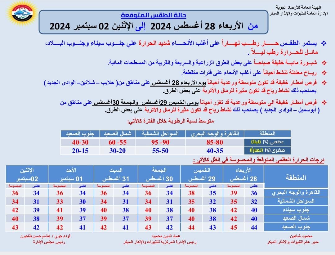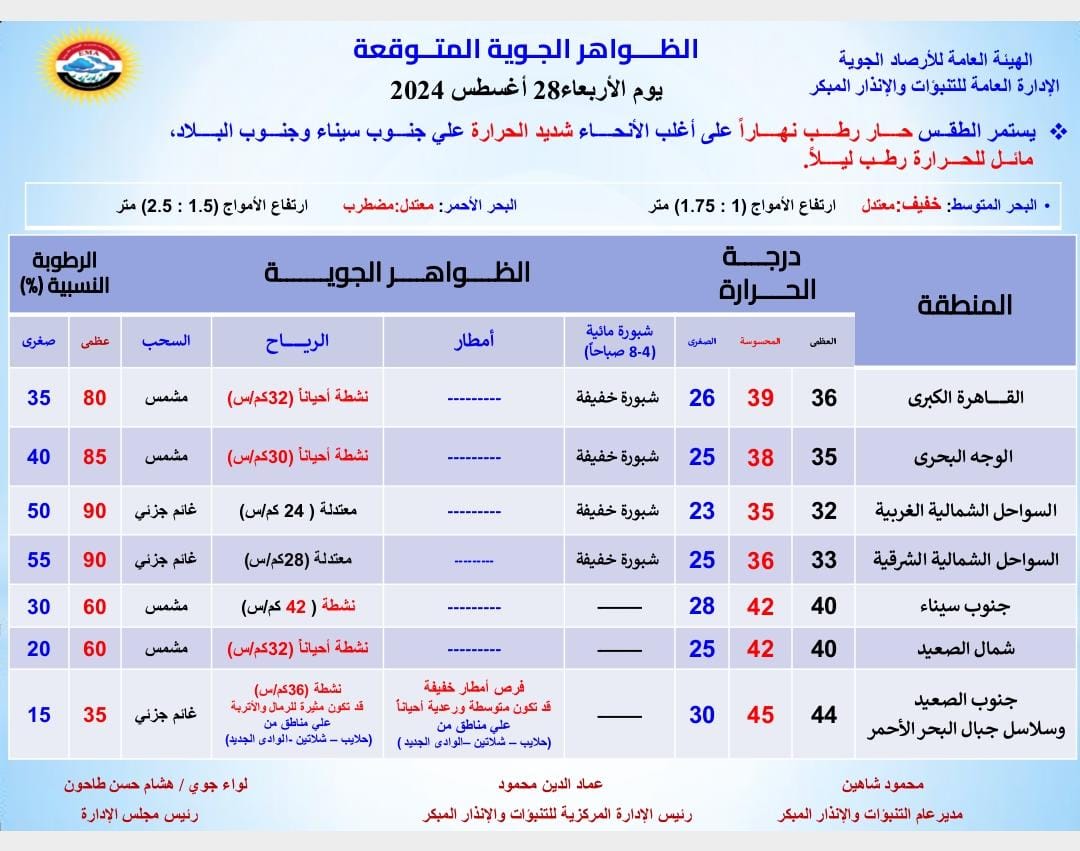 ونشرت هيئة الأرصاد الجوية بيانا بدرجات الحرارة المتوقعة اليوم الأربعاء على مدن ومحافظات مصر، وجاءت كالتالي: