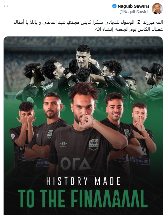 وكان نجيب ساويرس قد وجه رسالة لـ نادي زد، فور فوز زد على الإسماعيلي، أمس الثلاثاء، حيث قال عبر منصة "أكس": "ألف مبروك Z الوصول للنهائي شكرا كابتن مجدي عبد العاطي وياللا يا أبطال عقبال الكاس يوم الجمعه إن شاء الله"