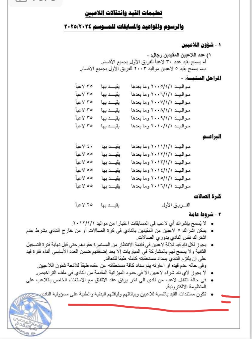 وذكر اتحاد الكرة في شروط القيد ضمن الشروط العامة للمسابقات بأن النادي مسئول عن مستندات القيد بالنسبة للاعبين ولياقتهم البدنية والطبية.