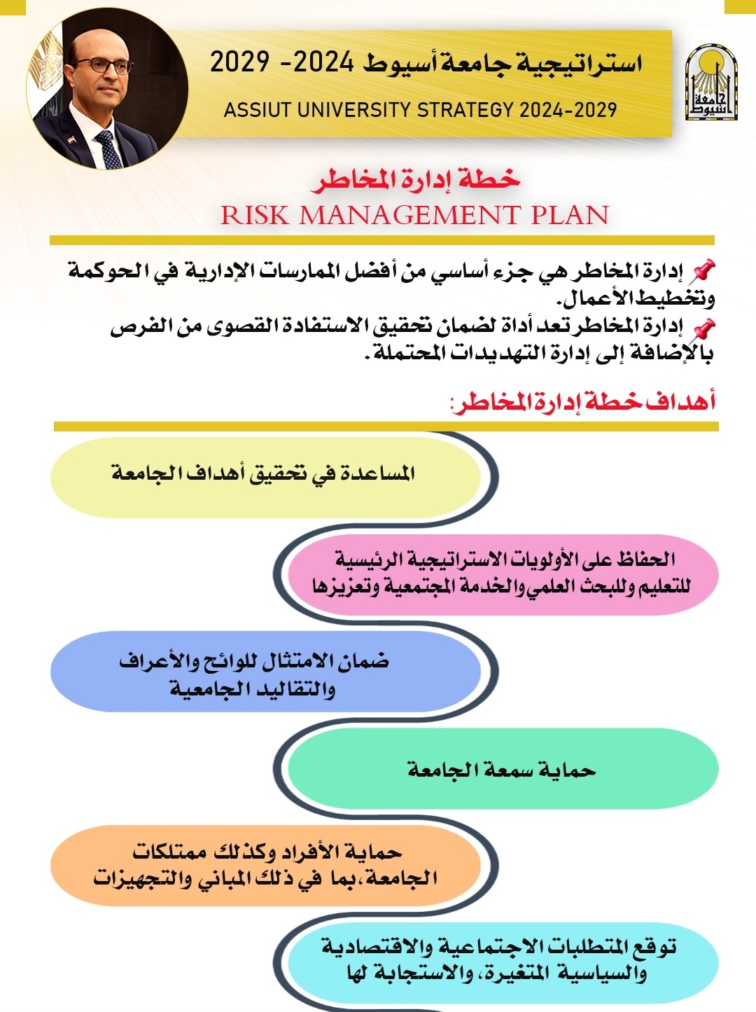 تحرص استراتيجية جامعة أسيوط (٢٠٢٤/ ٢٠٢٩)؛ علي تفعيل دور "إدارة المخاطر" بوصفها ركيزة أساسية للحفاظ علي الأولويات الاستراتيجية للجامعة، في مختلف مجالات؛ التعليم، والبحث العلمي، وخدمة المجتمع، ومواكبة التطورات المستمرة في بيئة العمل، وتطوير البنية التحتية، والمتابعة الدورية لكافة المرافق؛ وفقًا لمعايير السلامة، والصحة المهنية، وتحقيق الاستدامة، واستمرارية الأعمال، علي نحوٍ يسهم في تقدم، وتحسين الأداء المؤسسي، وتقديم مخرجات جامعية علي قدرٍ عالٍ من الجودة، والكفاءة.