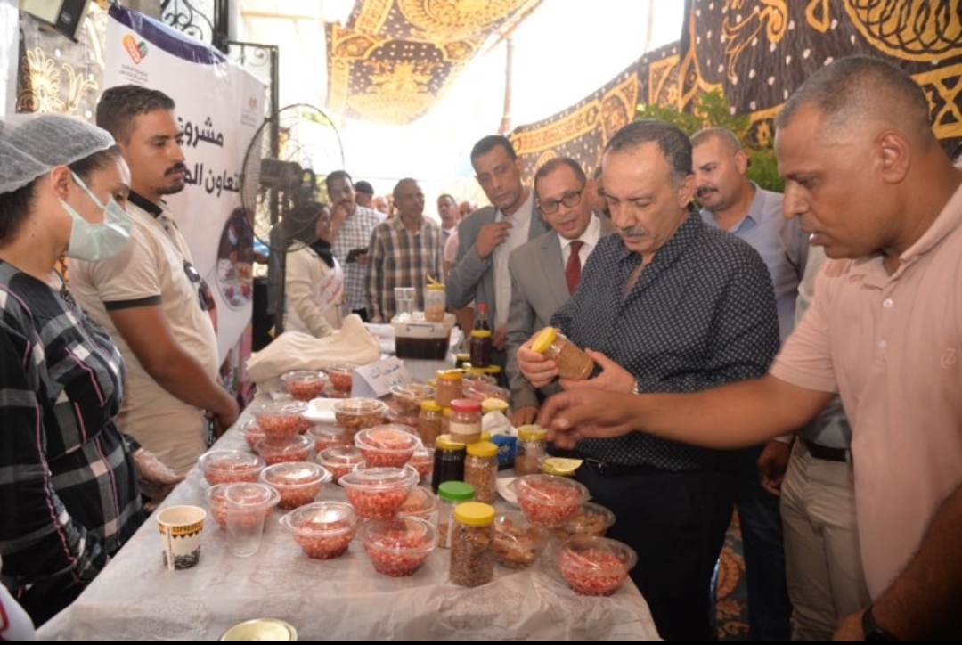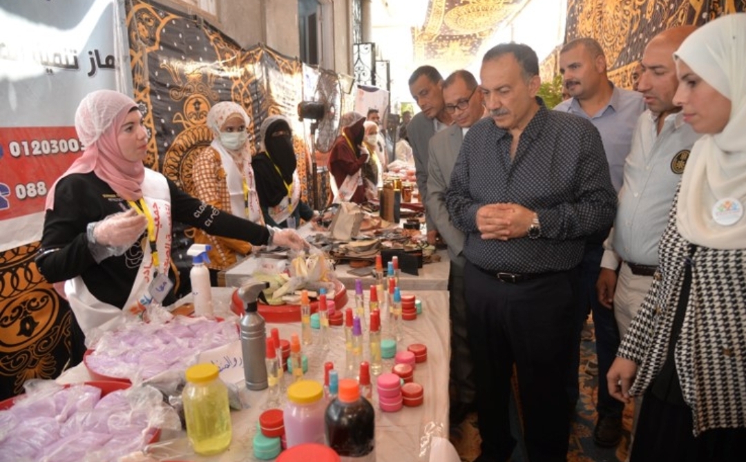 حيث تفقد المحافظ المعرض ويشمل قسم منتجات الرمان وتوابل منقشر الرمان وبذور الرمان، والمخللات بأنواعها ومستحضرات تجميلية من الرمان والليمون، منظفات وعطور، ومنتجات منسوجات "أعمال يدوية من صنع السيدات المترددات على الجمعية"، واعادة تدوير الورق وغيرها.