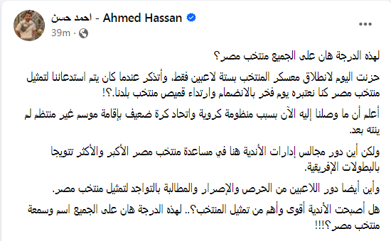 واستكمل أحمد حسن رسالته: أين أيضا دور اللاعبين من الحرص والإصرار والمطالبة بالتواجد لتمثيل منتخب مصر؟، هل أصبحت الأندية أقوى وأهم من تمثيل المنتخب؟، لهذه الدرجة هان على الجميع اسم وسمعة منتخب مصر؟!!!