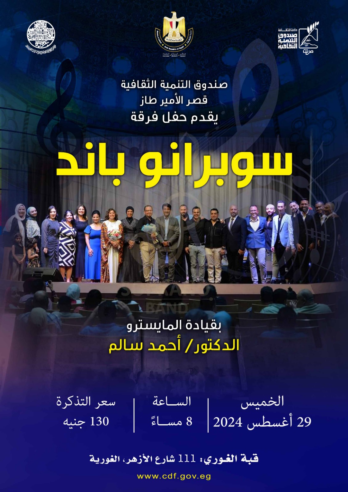يقيم مركز الإبداع الفني في قبة الغوري بشارع الأزهر، التابع لقطاع صندوق التنمية الثقافية برئاسة الدكتور وليد قانوش، حفل غنائي جديد لفرقة "سوبرانو باند" بقيادة المايسترو الدكتور أحمد سالم، في الثامنة مساء اليوم الخميس 29 أغسطس.