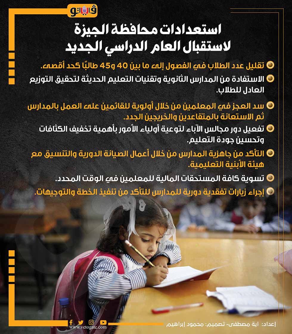 استعدادات محافظة الجيزة لاستقبال العام الدراسي الجديد (انفوجراف) الخميس 29/أغسطس/2024 - 04:35 م 8/29/2024 4:35:55 PM العام الدراسي الجديد آية مصطفى شارك طباعة 18 حجم الخط شارك طباعة العام الدراسي الجديد هيئة الأبنية التعليمية محافظة الجيزة سد العجز في المعلمين