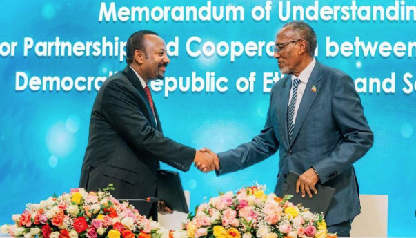 قضية اعتراف إثيوبيا باستقلال أرض الصومال أحدث توترًا كبيرًا بين الصومال وإثيوبيا، فإثيوبيا وقعت الاتفاقية مع إقليم أرض الصومال الانفصالي لتأجير 20 كيلومترًا من الأراضي الساحلية لدولة إثيوبيا الحبيسة (غير الساحلية).