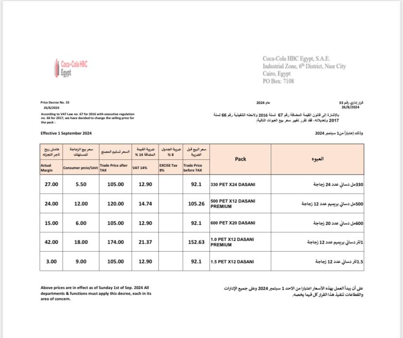 وأشار «المنوفي» إلى أن شركة كوكاكولا وفقًا للقرار الذي أرسلته للتجار، قررت رفع سعر مياه دساني من جنيه إلى جنيهين حسب العبوة.