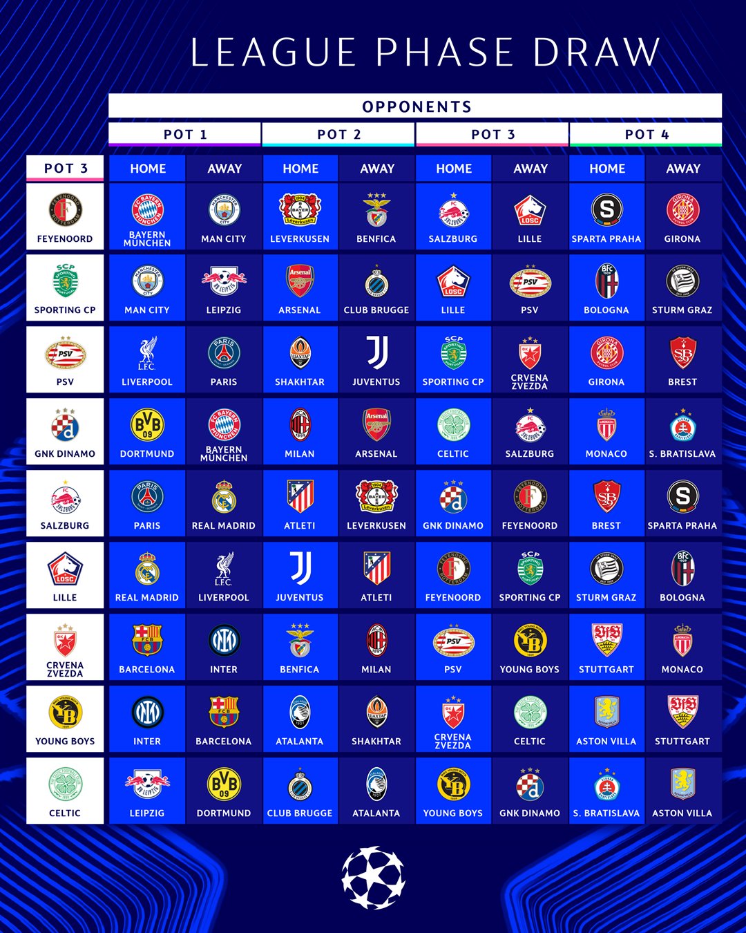 أما باريس سان جيرمان فسيواجه على ملعب حديقة الأمراء، أندية مانشستر سيتي وأتلتيكو مدريد وآيندهوفن وجيرونا، فيما يشد الرحال لمواجهة بايرن ميونخ وآرسنال وسالزبورج وستاد بريست.