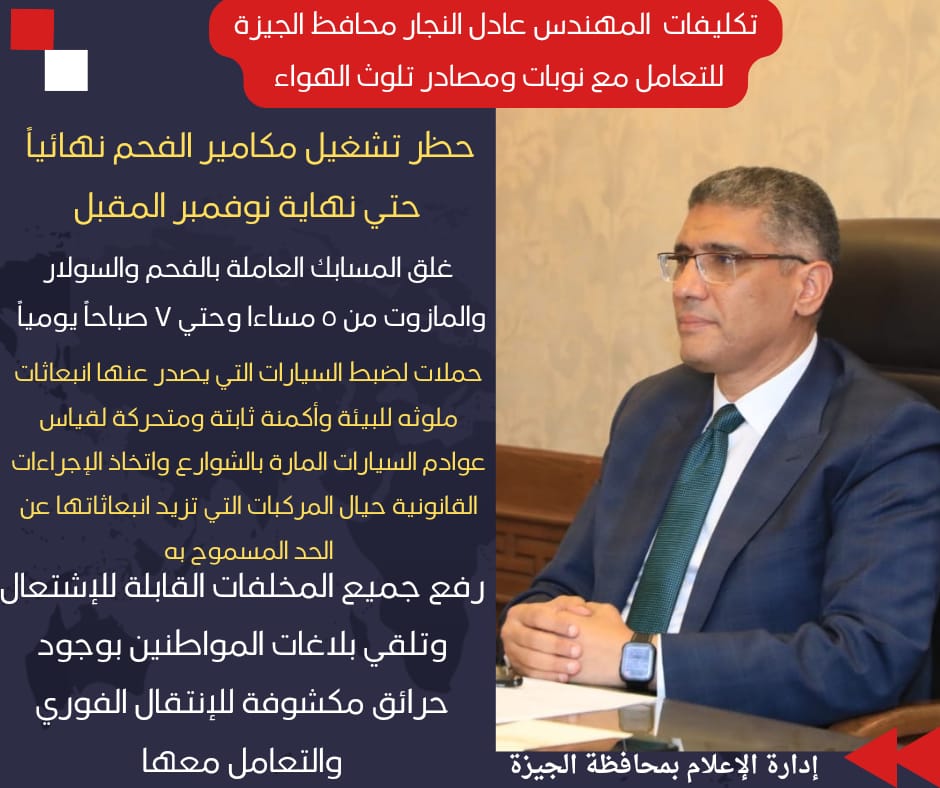 إجراءات حاسمة لمواجهة تلوث الهواء بالجيزة.. حظر تشغيل مكامير الفحم حتى نهاية نوفمبر المقبل.. مواعيد جديدة لغلق المسابك.. تشكيل لجنة للتصدي للسحابة السوداء.. وحملات لضبط أي سيارة تصدر عوادم