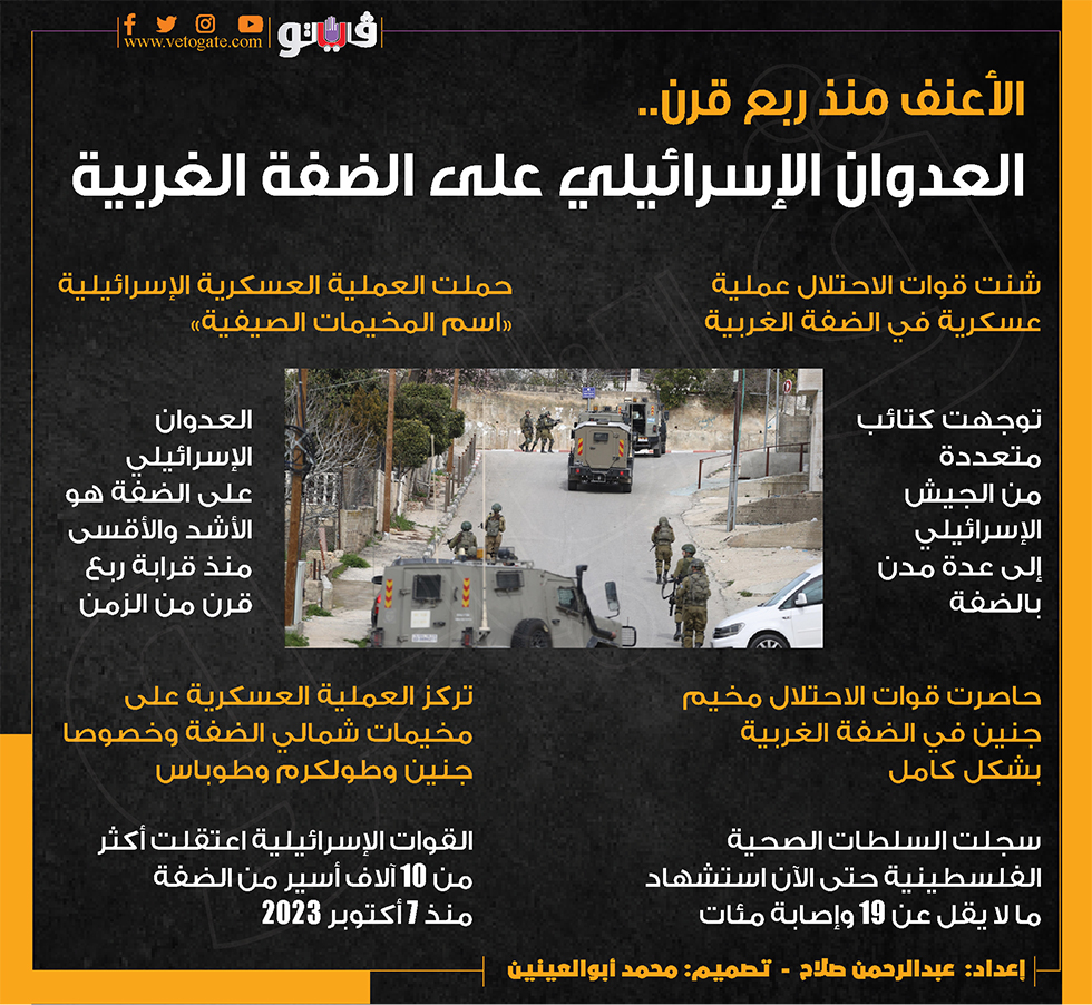 الأعنف منذ ربع قرن.. العدوان الإسرائيلي على الضفة الغربية (انفوجراف) السبت 31/أغسطس/2024 - 10:59 ص 8/31/2024 10:59:39 AM الضفة الغربية، فيتو عبدالرحمن صلاح شارك طباعة 18 حجم الخط شارك طباعة قوات الاحتلال المخيمات الصيفية الضفة الغربية الجيش الإسرائيلي مخيم جنين طولكرم طوباس