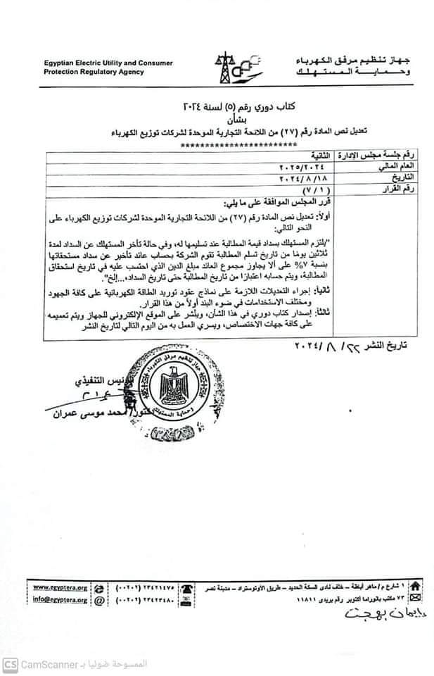 وأكد الجهاز في الخطاب المرسل لشركات توزيع الكهرباء على ضرورة أن « يلتزم المستهلك بسداد قيمة المطالبة “الفاتورة” عند تسليمها له، وحال تأخر المستهلك عن السداد لمدة 30 يومًا من تاريخ تسلم المطالبة تقوم الشركة بحساب عائد تأخير عن سداد مستحقاتها بنسبة 7% على ألا يجاوز مجموع العائد مبلغ الدين الذي يحتسب عليه في تاريخ استحقاق المطالبة ويتم احتسابه اعتبارًا من تاريخ المطالبة وحتى تاريخ السداد.