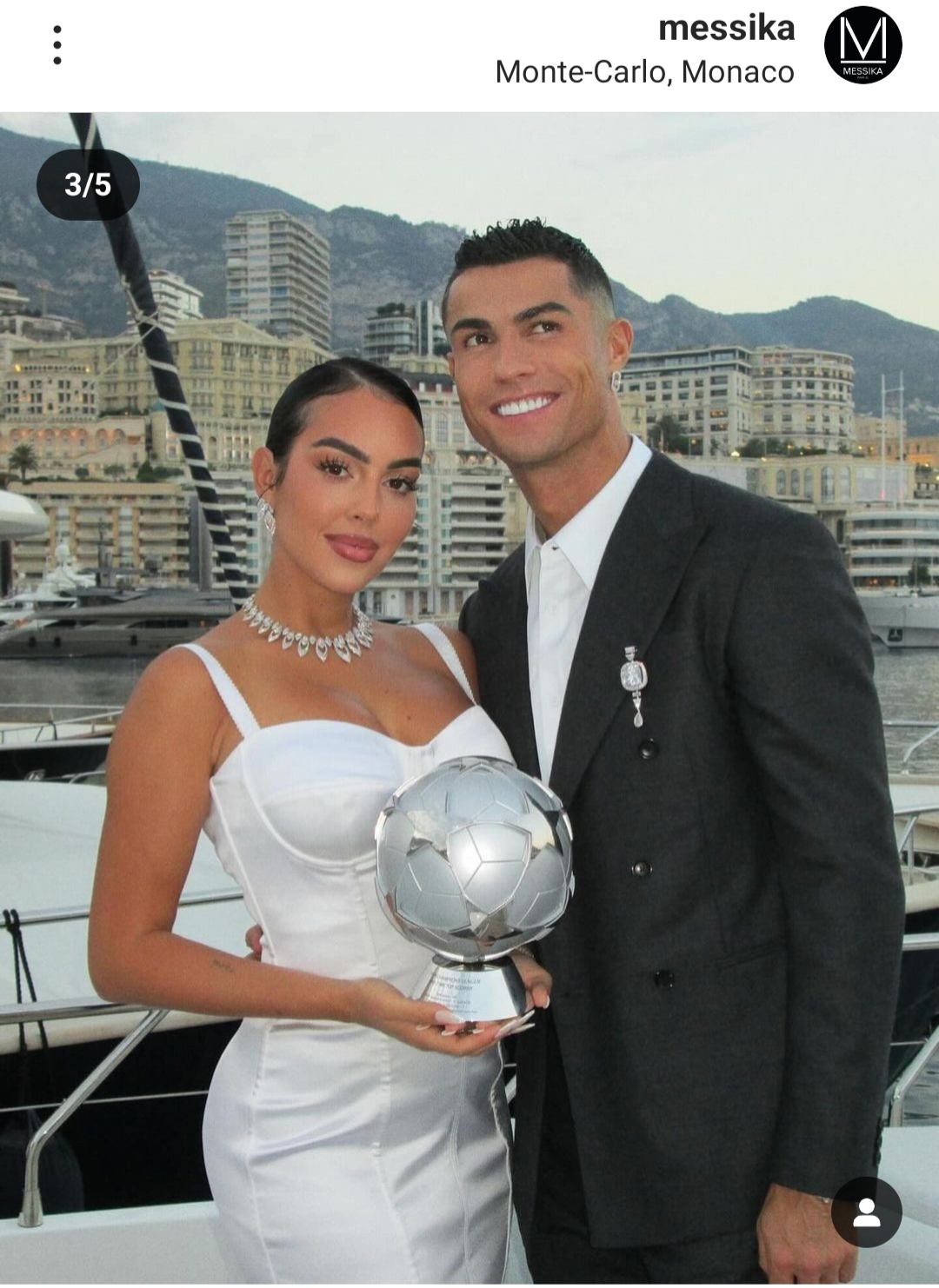 حيث ارتدى رونالدو "قلادة" من مجموعة Beyond The Light بماسة مذهلة بوزن 33 قيراطًا، مقطوعة من حجر خام نادر بوزن 110 قراريط اُكْتُشِف في منجم بدولة بوتسوانا.