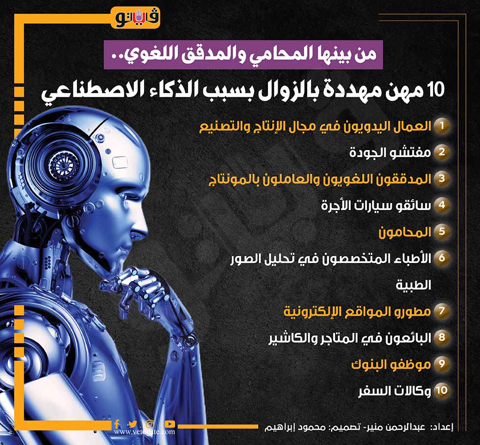 من بينها المحامي والمدقق اللغوي..10 مهن مهددة بالزوال بسبب الذكاء الاصطناعي (إنفوجراف) السبت 31/أغسطس/2024 - 10:00 م 8/31/2024 10:00:58 PM المحامون، فيتو عبدالرحمن منير شارك طباعة 18 حجم الخط شارك طباعة الذكاء الاصطناعي المحامون المواقع الالكترونية