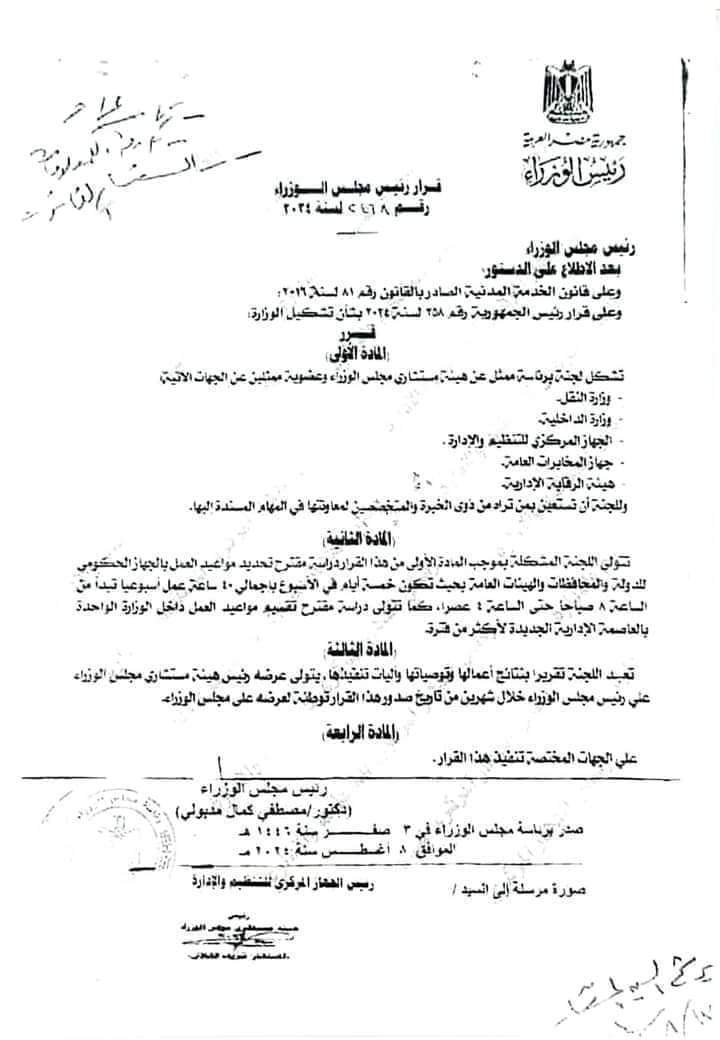 أصدر الدكتور مصطفى مدبولي، رئيس الوزراء قرارًا بتشكيل لجنة متخصصة لدراسة مقترح تعديل مواعيد العمل في الجهاز الحكومي على مستوى الدولة والمحافظات والهيئات العامة.